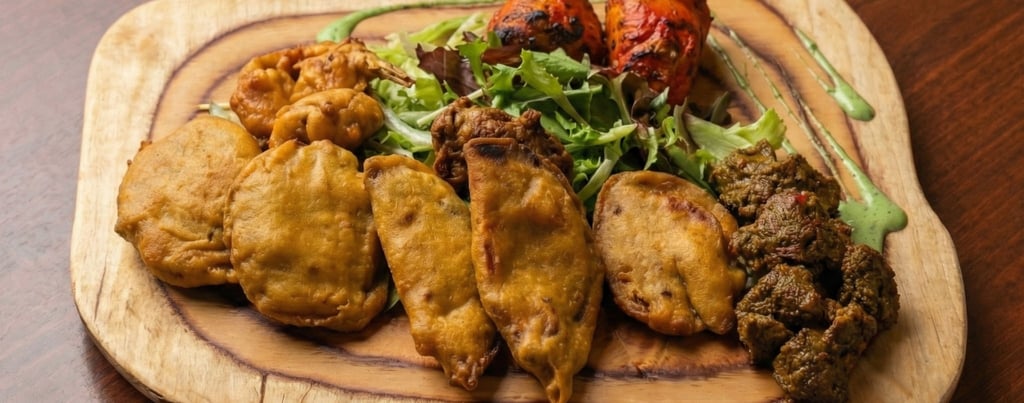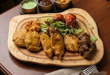 Tikkas au poulet, aux gambas, au bœuf et assortiment de pakoras